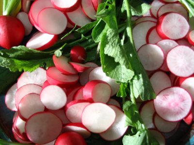This is a very simply and extremely delicious recipe. Since our first radish harvest at the farm, I have been adding them to many things for that extra crunch and spice. Try adding this salad onto sandwiches, toast, and bagels with cream cheese, or serve as a side dish. – Derek