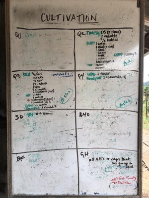 In order for the group to know which bed to go to during the work day and which cultivation task to complete, I put out signs stating if the bed needs a hand hoe, stand up hoe, quick hand weed, or hand pull. Every Friday, I venture out to each field and greenhouse to determine the urgency and task needed for cultivation on each crop during the following week. I then place the signs to the corresponding beds and write that action down on a piece of paper. After my field walk, I write notes about which crop needs which cultivation task on a dry erase board that is broken up by field. It’s important to prioritize which crops need to be tended to first based on weed growth so that we don’t, knock on wood, lose any crops.