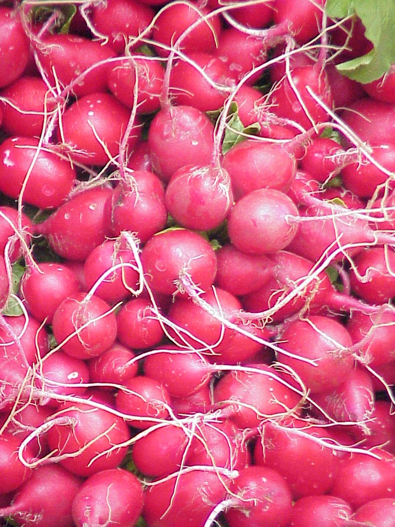 Generous bunch of crisp cool delicious ruby red radishes. Keep them in a bowl of water in the fridge for quick snacks.