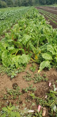 First, as a farmer, swiss chard is a pretty awesome crop in that the same plant can be harvested many times. Here at Horton Road we only plant chard twice a season, one bed each time, and that provides all the chard the farm will sell all season long. Swiss chard can do this in part because it is a very versatile plant that can handle a fairly wide range in weather and also since we harvest and eat the leaves of the plant, the more we pick, the more the plant works to replace its foliage. The variety of swiss chard we grow is called Bright Lights, and as you have seen produces an amazing array of colorful stems and hues of leaves. Despite the differences in color all chard shares a comparable taste and nutrition.